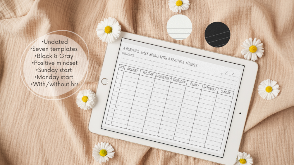 The Ultimate Digital Weekly Planner: Your versatile, undated solution for a productive week with seven unique templates, Monday/Sunday start options, and a choice between elegant black and sophisticated gray paper backgrounds.