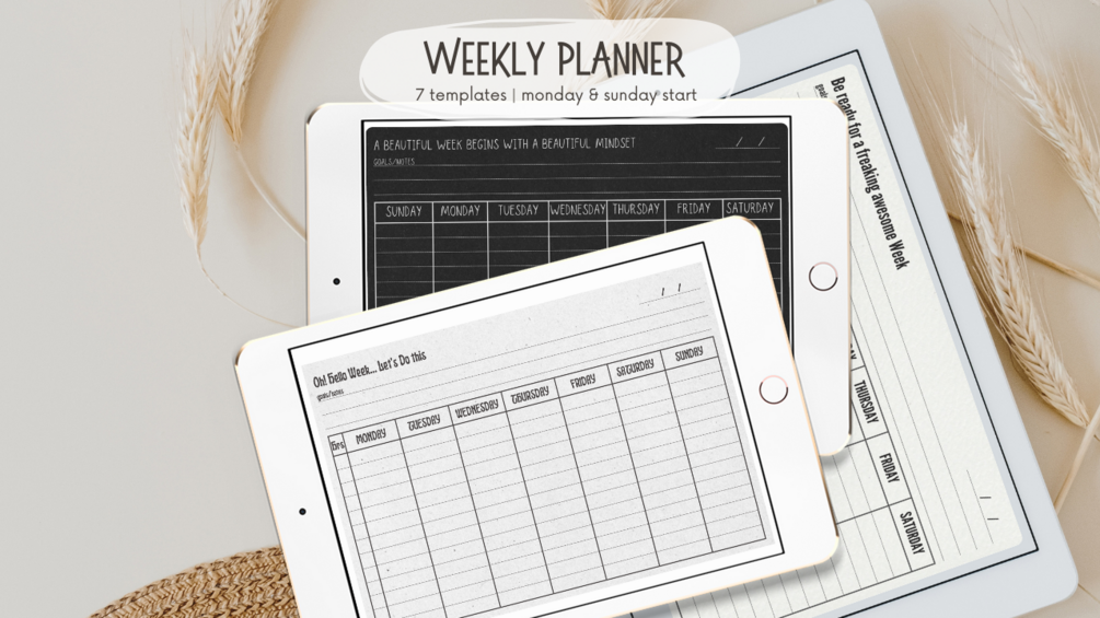 The Ultimate Digital Weekly Planner: Your versatile, undated solution for a productive week with seven unique templates, Monday/Sunday start options, and a choice between elegant black and sophisticated gray paper backgrounds.
